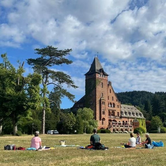 Im Sommer finden die Kurse auch gerne mal draußen statt. Auf einer großen Rasenfläche unweit der Yogaräumlichkeiten mit Blick über das Tal.